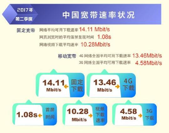 日前,寬帶發(fā)展聯(lián)盟發(fā)布了第 16 期《中國寬帶速率狀況報(bào)告》(2017 年第二季度)。報(bào)告顯示 2017 年第二季度我國固定寬帶網(wǎng)絡(luò)平均下載速率達(dá)到 14.11Mbit/s,比 2017 年第一季度提高了1.1Mbit/s,同比去年第一季度提升了 34.8%。自 2015 網(wǎng)絡(luò)“提速降費(fèi)”工作開展以來,我國固定寬帶可用下載速率連續(xù) 10 個(gè)季度持續(xù)提升,總提升幅度達(dá)到 3.3 倍。同時(shí),我國移動(dòng)寬帶用戶使用 4G 網(wǎng)絡(luò)訪問互聯(lián)網(wǎng)時(shí)的平均下載速率達(dá)到 13.46Mbit/s,環(huán)比 2017 年第一季度也有 14.2%的提升。
